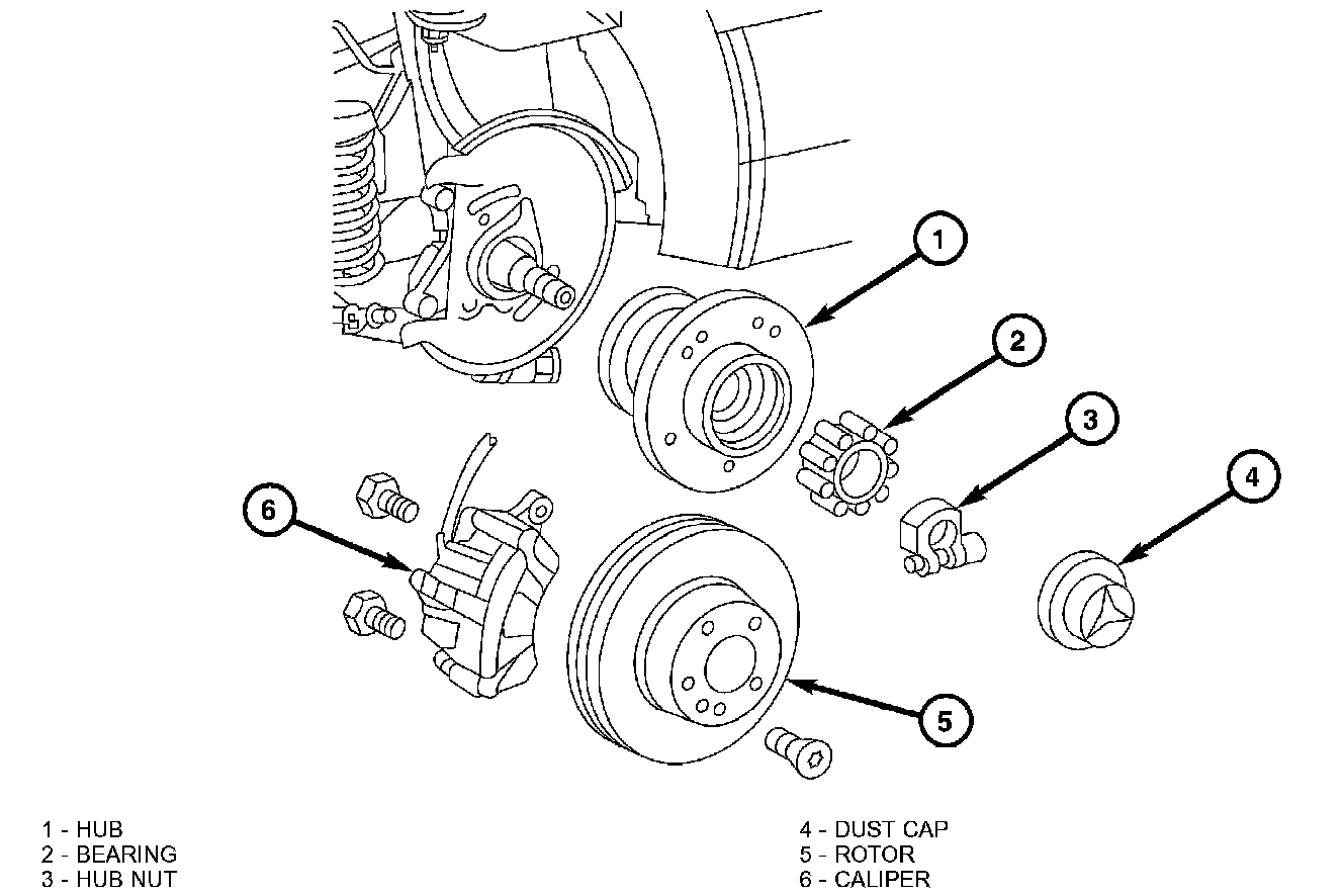 HUB/BEARINGThe bearing (2) used in the front hub (1) of this vehicle is a roller bearing unit type. This assembly combines the front wheel hub (1) and the front wheel bearing (2) into a two piece unit. The hub nut (3) holds the bearing (2) and the front hub (1) to the steering knuckle's spindle. The hub nut (3) has a locking bolt that locks the hub nut into position on the spindle. The bearing is protected from outside elements by a metal dust cap (4). The bearings (2) can only be replaced as a set. The bearings and the wheel hub can be replaced independently of one another.