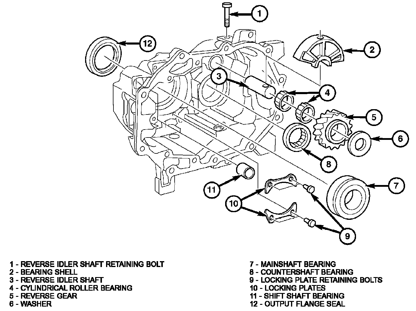 4. Remove the bearing shell (2), reverse idler shaft (3) with the bearings (4), reverse gear (5) and the washer (6).
