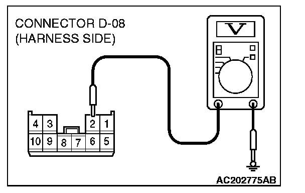 1. Measure the voltage available at the harness side of sunroof motor assembly connector D-08 without disconnecting sunroof motor assembly.