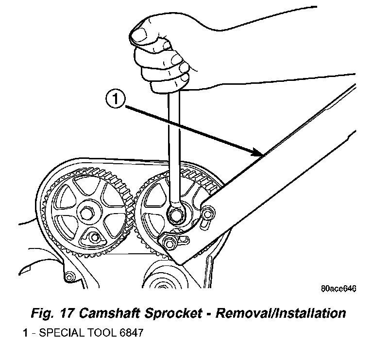 2. Hold each camshaft sprocket with Special Tool 6847 while removing center bolt (Fig. 17).