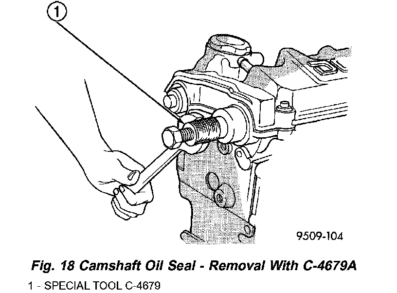 5. Remove camshaft seal using Special Tool C-4679A (Fig. 18).