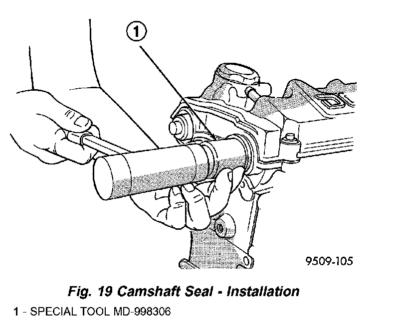 2. Install camshaft seals into cylinder head using Special Tool MD-998306 until flush with head (Fig. 19).