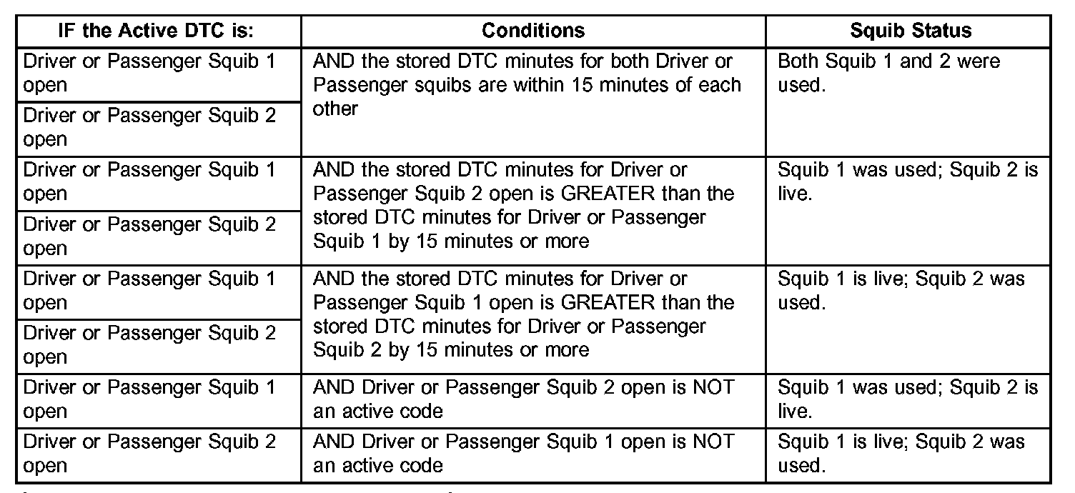 Using the active DTC information, refer to the Airbag Squib Status table to determine the status of both driver and/or passenger airbag squibs.