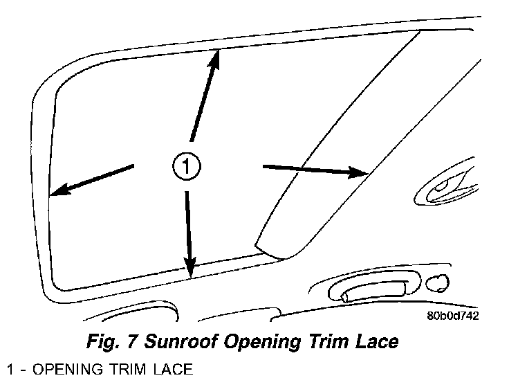 Remove lace by starting at the joint and pull one end of the lace away from the headliner until the entire lace is removed (Fig. 7).