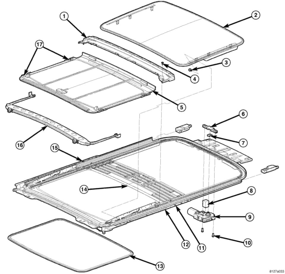 1. Place butt joint of trim lace into position starting at the rear of the opening at the butt joint notch (14) in the U-frame.