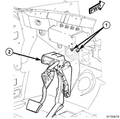 11. Loosen two nuts (1) fastening pedals assembly (2) to upper dash panel bracket.