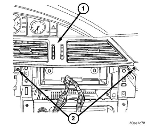 3. Install the two screws (2) that secure the bottom of the center air outlet to the instrument panel. Tighten the screws to 2 Nm (17 in. lbs.).