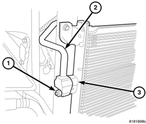 6. Connect the A/C discharge line (2) to the A/C condenser (3).