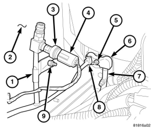 9. Install the nut (9) that secures the A/C liquid line to the right front strut tower (2). Tighten the nut securely.