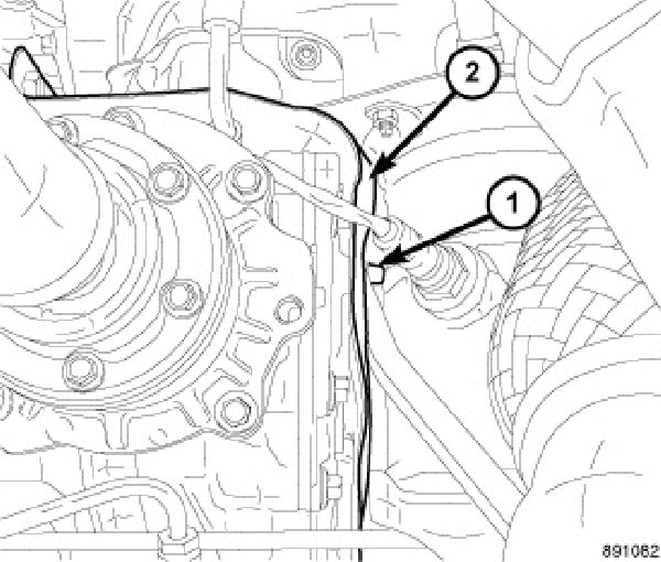 7. Use an allen wrench with 1-1/8" clearance (1) to remove the PTU fill plug (2).