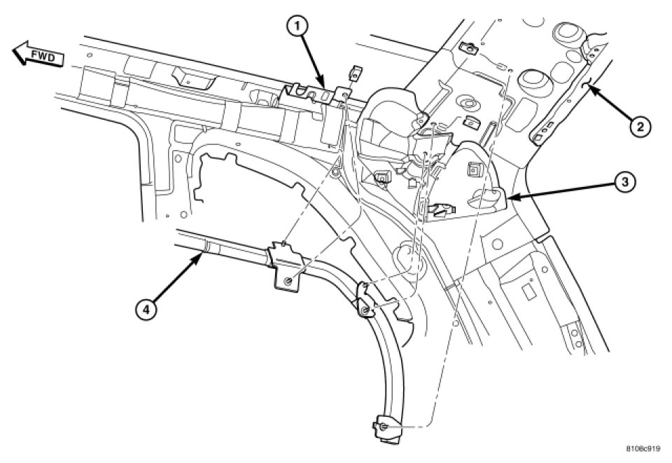 Remove the retaining screws at the D-pillar to the curtain airbag (4).