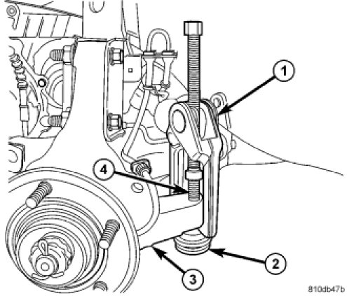 18. Place Press (2), Special Tool C-4150A, over ball joint stud and nut (4) as shown. Release ball joint stud from steering knuckle (1) by tightening tool screw-drive. To ease Remover installation and use, it may help to rotate knuckle around so inside of knuckle faces outward.