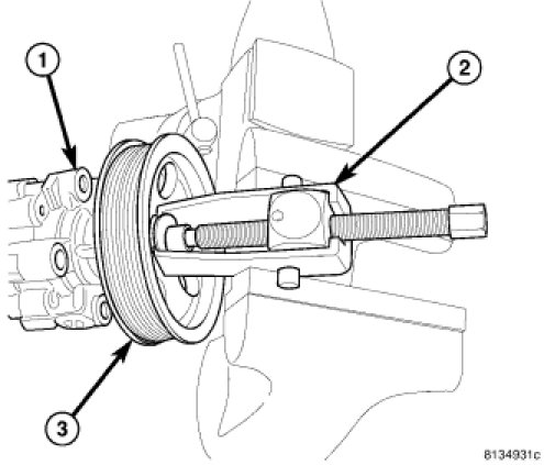CAUTION: Do not hammer on power steering pump pulley or shaft to remove power steering pump pulley. This will damage pulley and power steering pump.