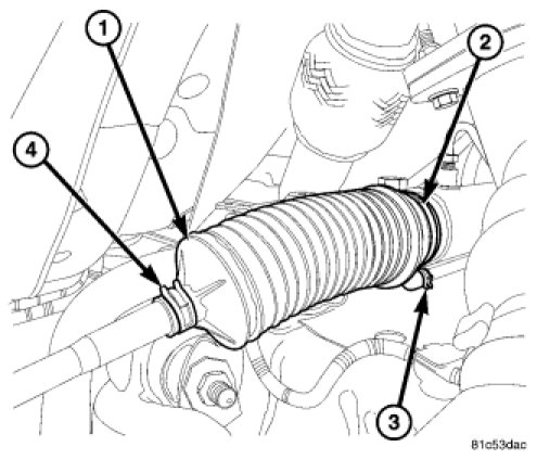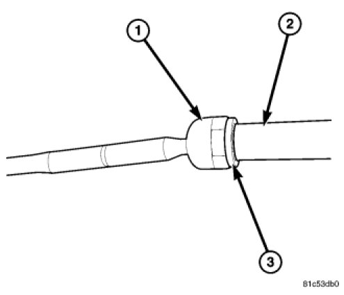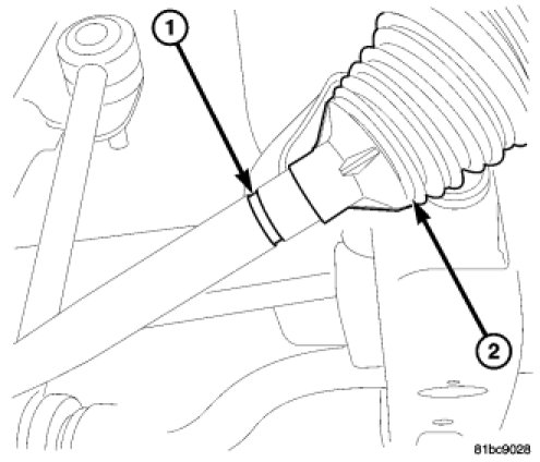 8. Apply a small amount of Mopar(R) Lubriplate or equivalent uniformly to groove (1) in inner tie rod shaft. This allows for toe adjustment without twisting bellows.