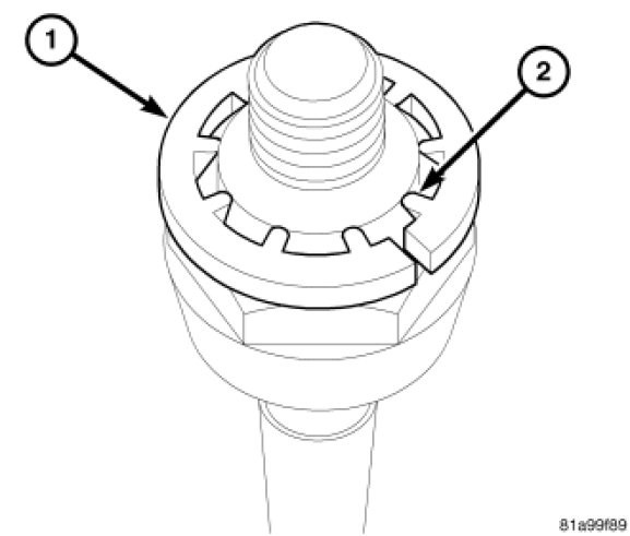 1. Install travel restrictor (1), flat side of teeth (2) facing out, on inboard end of inner tie rod ball joint.