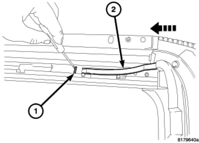 2. Press the spring lock (1) with a small flat bladed tool and push the wind deflector (2) reward to release from the car top opening.