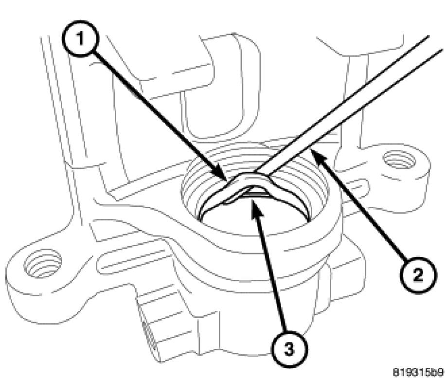 9. Using a soft tool such as a plastic trim stick (2), work the piston seal (1) out of its groove (3) in the caliper piston bore. Discard the used seal.