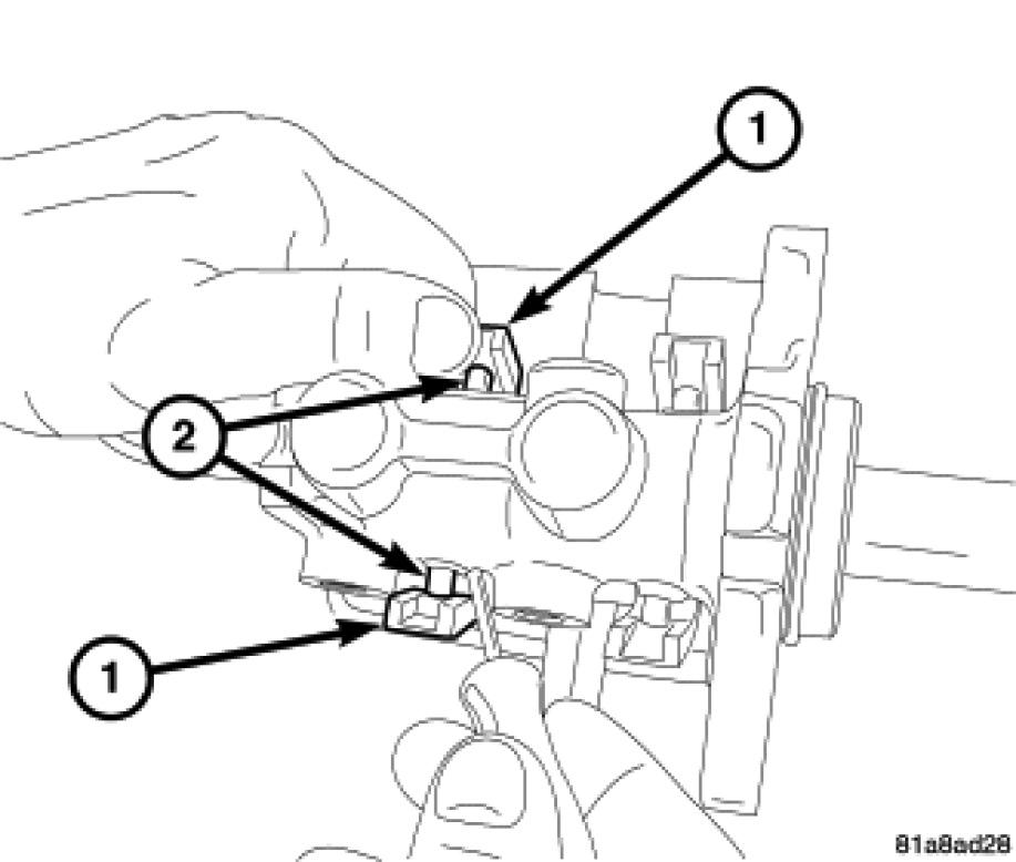 5. If the reservoir is being replaced, remove the fluid level switch. Push together the retaining tabs (1) holding the brake fluid level switch in place in the brake fluid reservoir (2), then pull the brake fluid level switch out the opposite side of the reservoir.