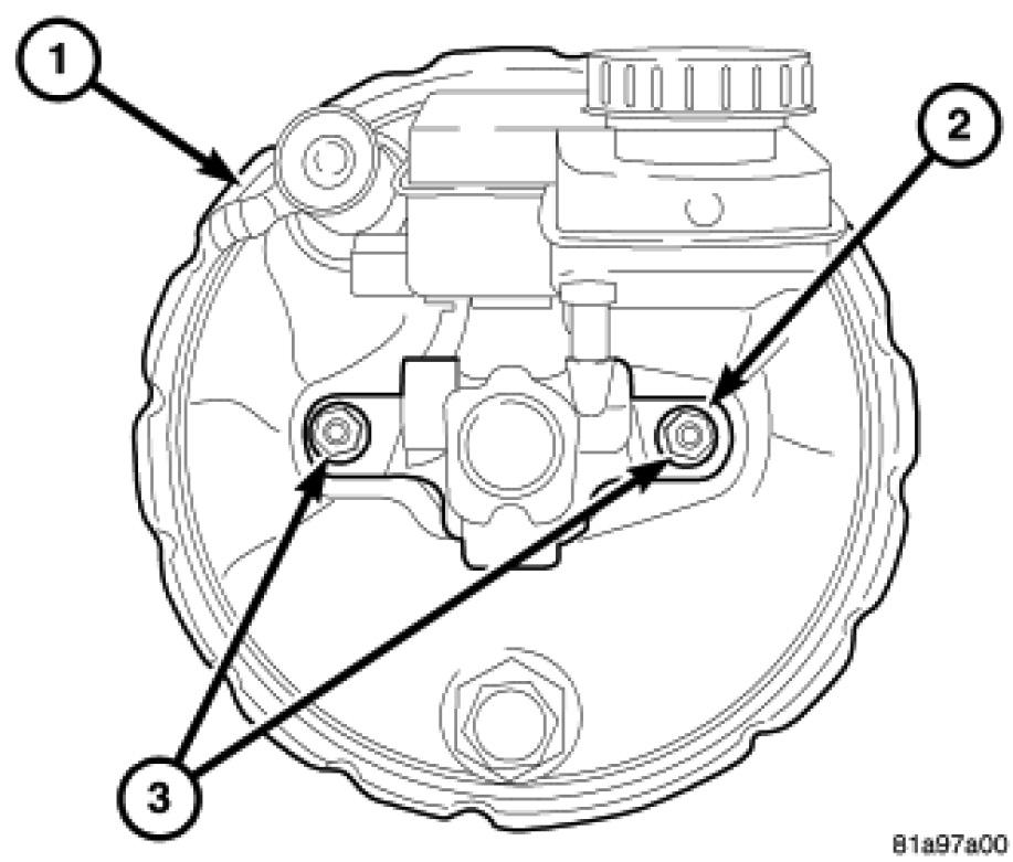 5. Install two NEW master cylinder mounting nuts (3). Tighten each nut to 25 Nm (18 ft. lbs.).