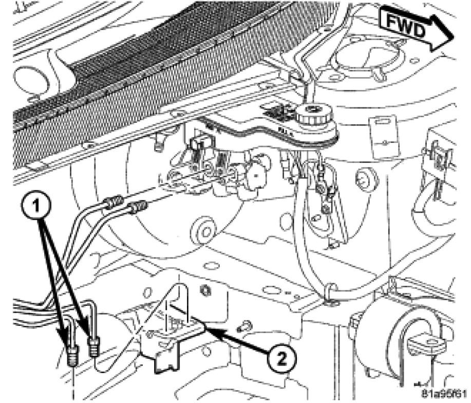 4. Disconnect the rear brake tubes (1) at the junction block (2). Install plugs at all of the open brake tubes.