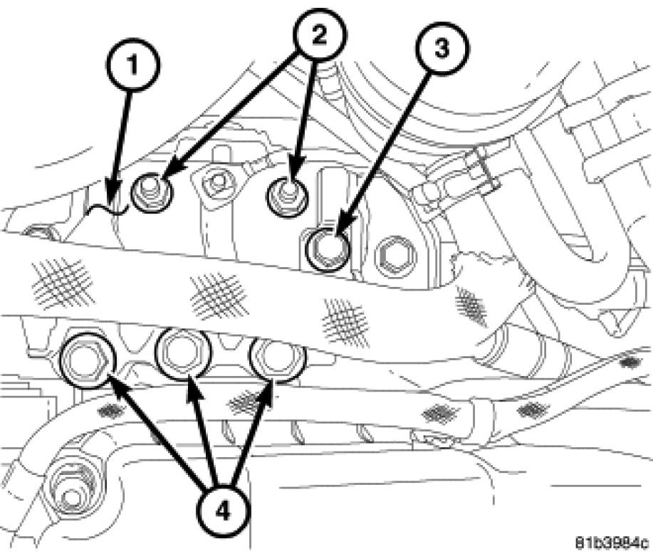 2. Remove power steering line support bracket (3) from engine mount.