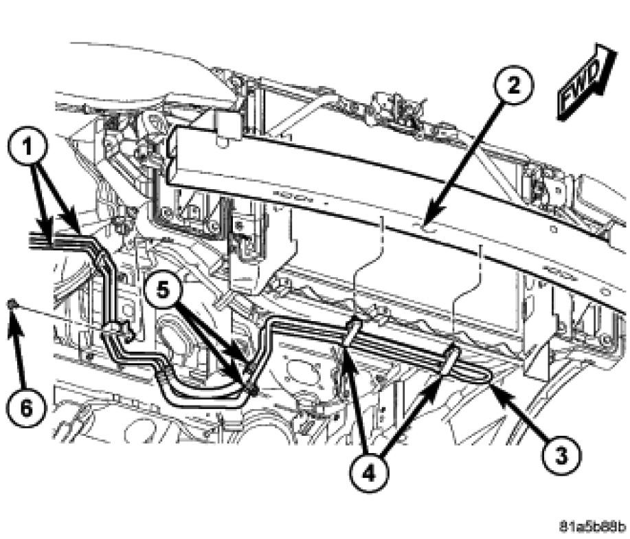 5. Remove the hose clamps (5) attaching the fluid return hoses (1) to the power steering fluid cooler line (3). Separate the return hoses from the cooler line.
