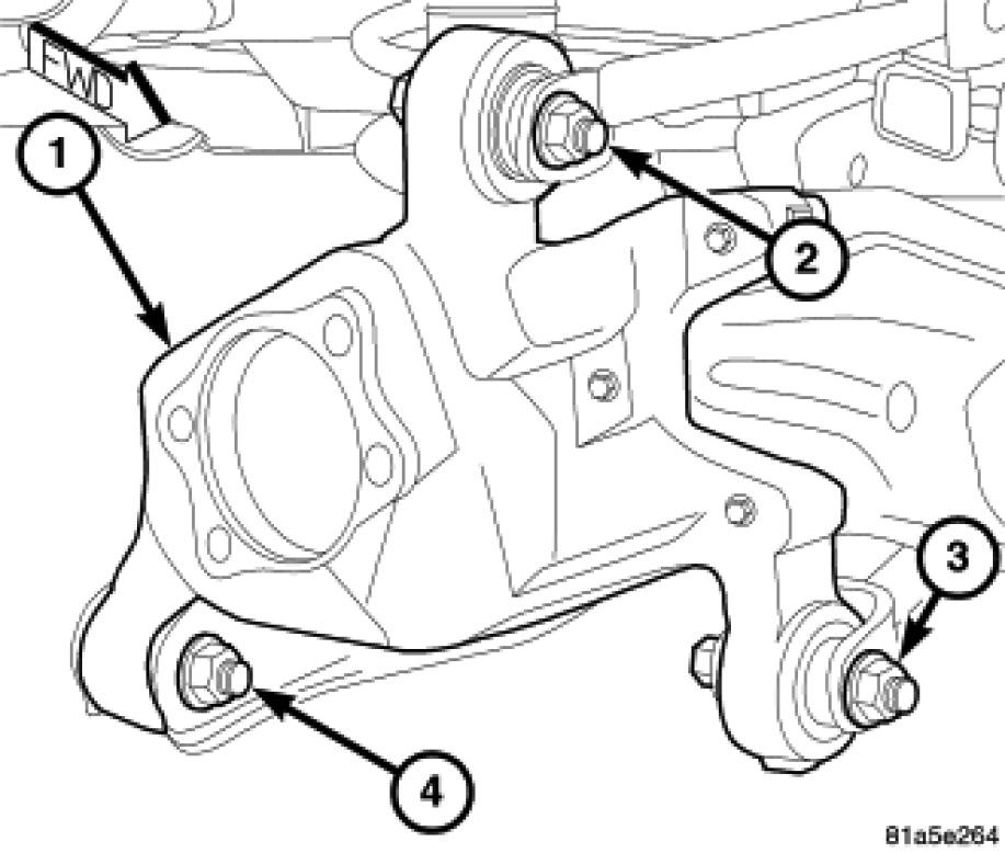 3. Install the bolt and nut (2) securing the lower control arm to the knuckle. Tighten the mounting bolt nut to 105 Nm (77 ft. lbs.).