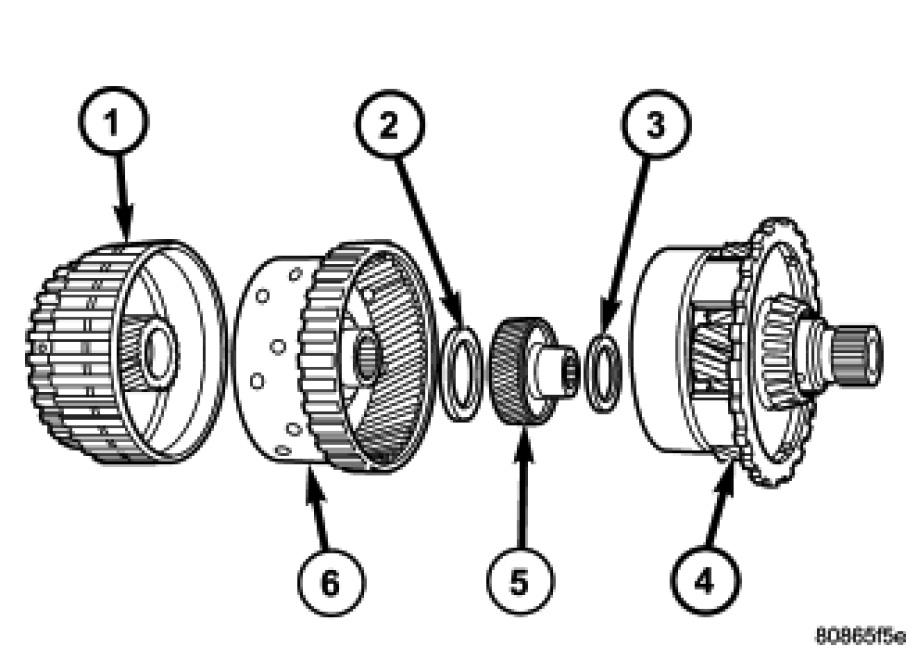 The planetary geartrain is located between the input clutch assembly and the rear of the transaxle case. The planetary geartrain consists of two sun gears (1,5), two planetary carriers, two annulus (ring) gears (4,6), and one output shaft.