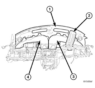 4. Remove the four screws that secure the passenger side instrument panel duct and demister duct assembly (4) to the instrument panel and remove the duct assembly.