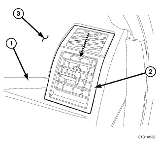 1. Using Trim Stick C-4755 (1) or equivalent, gently pry on both sides of the outboard instrument panel air outlet(s) (2), near the bottom of the outlet, until the air outlet snap clip retainers are released from the face of the instrument panel (3).