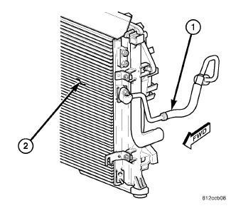 The A/C discharge line (1) is the refrigerant line that carries refrigerant from the A/C compressor to the A/C condenser (2).