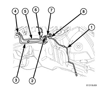 The A/C liquid line is the refrigerant line that carries refrigerant from the A/C condenser to the A/C evaporator. The A/C liquid line is serviced in two sections. The front section of the liquid line (1) connects to the rear section of the liquid line (5) with a nut (2) and includes the high side service port (8). The rear section of the A/C liquid line includes the fitting for the A/C pressure transducer (6) and a mounting bracket (7) and is secured to the A/C expansion valve by a tapping plate (4). The rear section of the A/C liquid line is serviced as an assembly with the rear section of the A/C suction line (3).