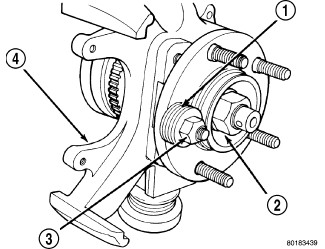 2. Tighten nut (3), pulling wheel stud into hub flange. Once head of stud is fully seated against rear of hub flange, remove nut and washers from stud.