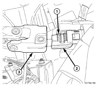 3. Align the intermediate shaft upper coupling (3) with the steering column shaft plastic alignment fin (2), then carefully slide the intermediate shaft onto the column shaft (1).