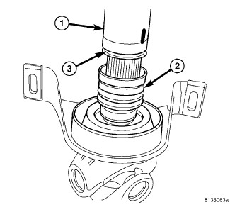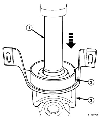 1. Install propeller shaft rear segment into press, supported on joint yoke (3).
