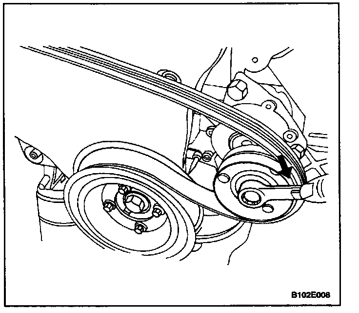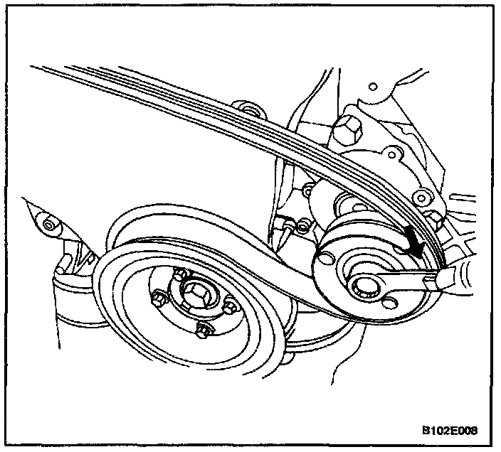 6. Remove the accessory drive belt by lowering the vehicle and turning the automatic pensioner roller bolt clockwise to relieve tension on the belt.