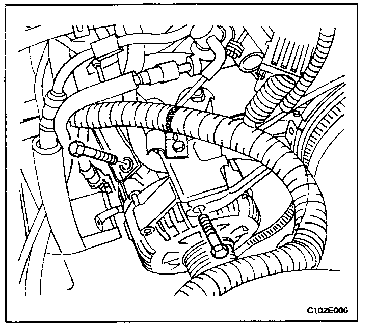 8. Remove the generator upper mounting bolts to the intake manifold/cylinder head support bracket, the intake manifold strap bracket, and the intake manifold-to-cylinder body strap bracket.