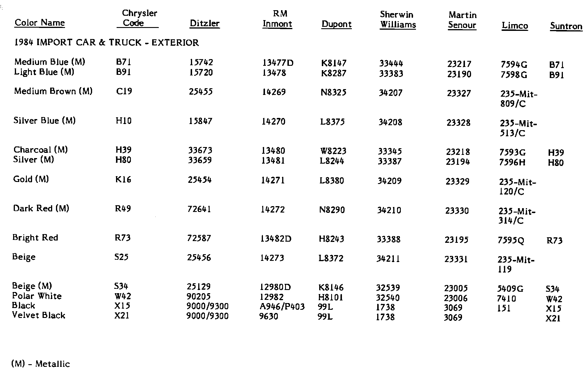 In both cases the additional letter and digit will correspond to the letter and digit on the following sheets. These sheets cover all domestic and import cars and trucks for 1984... Various paint manufacturer's reference paint codes can be found listed to the right of the Chrysler code.