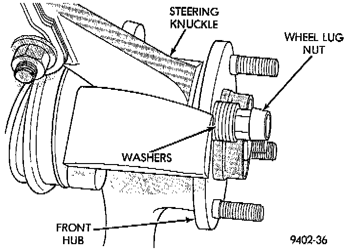 2. Tighten the wheel lug nut, pulling the wheel stud into the flange of the hub and bearing assembly. When the head of the stud is fully seated against the bearing flange, remove lug nut and washers from wheel stud.