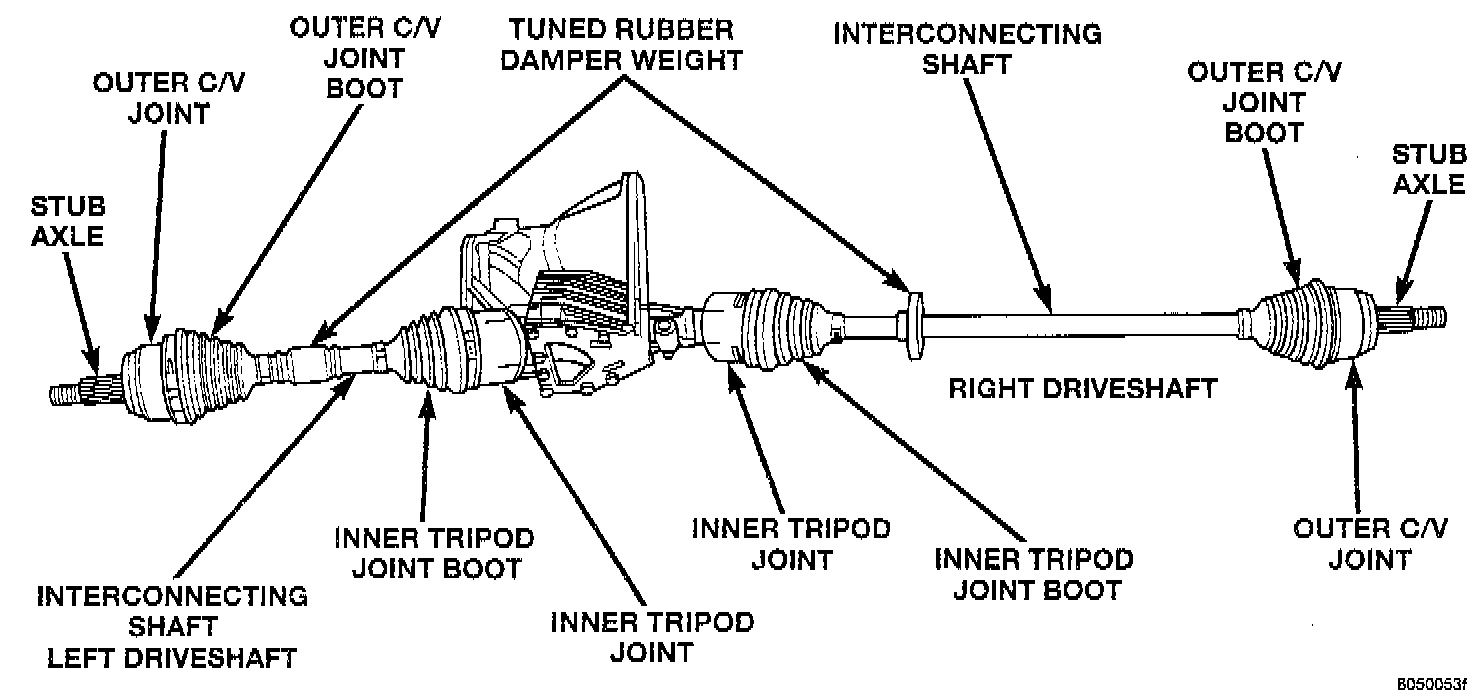 Both driveshaft assemblies use the same type of inner and outer joints. The inner joint of both driveshaft assemblies is a tripod joint, and the outer joint of both driveshaft assemblies is a Rzeppa joint. Both tripod joints and Rzeppa joints are true constant velocity (C/V) joint assemblies. The inner tripod joint allows for the changes in driveshaft length through the jounce and rebound travel of the front suspension.