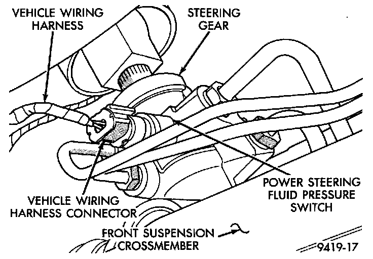 6. Install the vehicle wiring harness connector onto power steering fluid pressure switch on steering gear assembly. Be sure locking tab on wiring harness connector is securely latched to pressure switch.