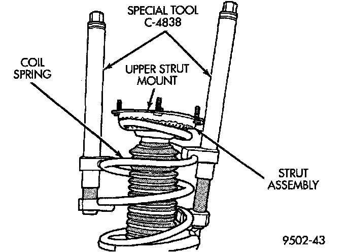 3. Position Spring Compressors, Special Tool C-4838 on the strut assembly spring. Compress coil spring until all load is removed from upper strut mount assembly.