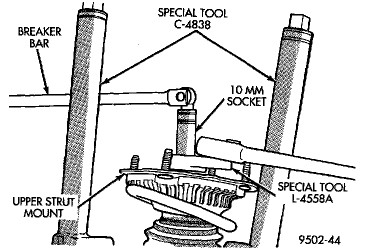 9. Using Strut Rod Socket, Special Tool, L-4558A and a 10 min socket to keep strut shaft from turning, torque the strut shaft nut to 61 Nm (45 ft. lbs.).