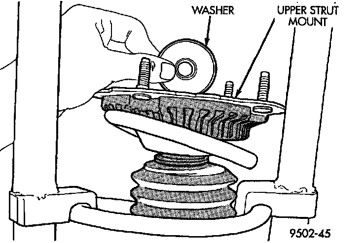 7. Install the washer on the strut assembly upper mount. Washer must be installed with the raised edge of the washer facing down.