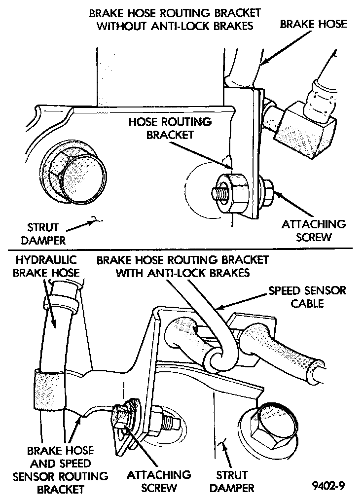 3. Install the hydraulic brake hose routing bracket and attaching screw onto strut damper bracket. If the vehicle is equipped with Antilock brakes, the hydraulic hose routing bracket is combined with the speed sensor cable routing bracket. Torque bracket attaching bolts to 13 Nm (10 ft. lbs.).