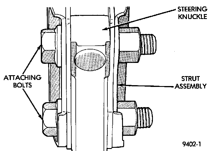 CAUTION: The steering knuckle-to-strut assembly attaching bolts are serrated and must not be turned during removal. Remove nuts while holding bolts stationary in the steering knuckles.