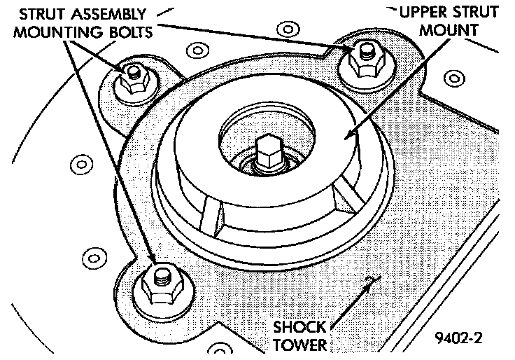 1. Install strut assembly into strut tower, aligning the 3 studs on the upper strut mount into the holes in shock tower. Install the 3 upper strut mount retaining nut and washer assemblies. Torque the 3 nuts to 31 Nm (23 ft. lbs.).