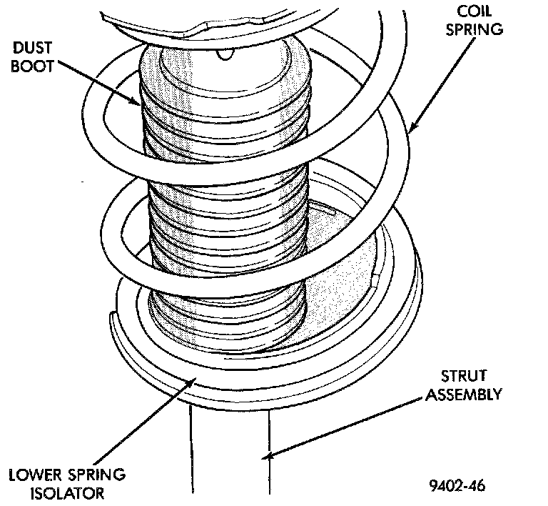 4. Lift the dust boot and inspect strut assembly for evidence of fluid running from the upper end of the fluid reservoir. (Actual leakage will be a stream of fluid running down the side and dripping off lower end of unit). A slight amount of seepage between the strut rod and the strut shaft seal is not unusual and does not affect performance of the strut assembly. Also, inspect the jounce bumper for signs of damage or deterioration.