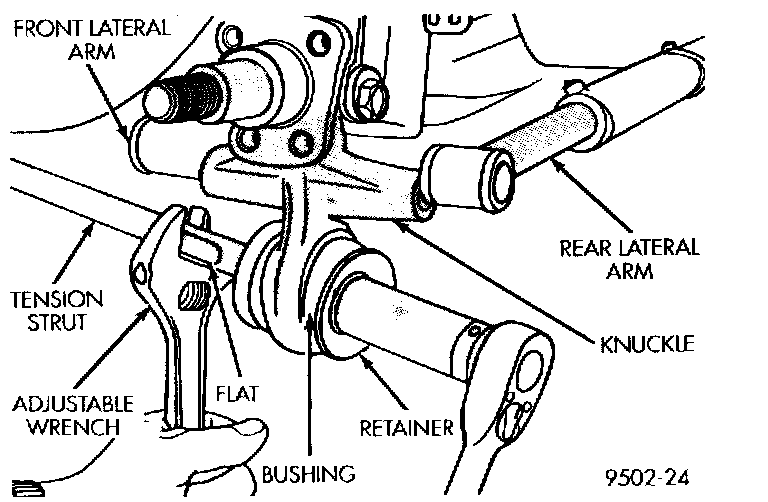 3. Hold the tension strut from turning by using a wrench on the flat of the tension strut and remove tension strut nut at the knuckle. Then remove the tension strut retainer and rear tension strut bushing half from the tension strut at the rear knuckle.