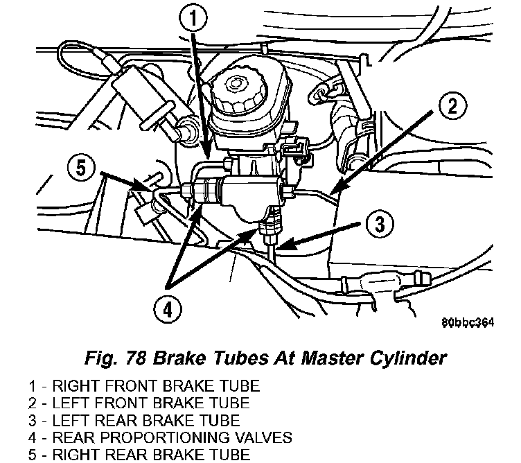 The non-ABS master cylinder is a four-outlet design (one for each wheel brake) with two screw-in proportioning valves (one for each rear wheel brake). One is attached directly to the inboard side of the master cylinder housing while the other is attached to the bottom.